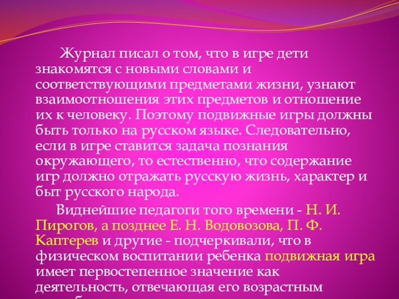 Виднейшие педагоги того времени - Н. И. Пирогов, а позднее Е. Н. Водовозова, П. Ф. Каптерев и другие - подчеркивали, что в физическом воспитании ребенка подвижная игра имеет первостепенное значение как деятельность, отвечающая его возрастным потребностям, и как средство всестороннего развития.