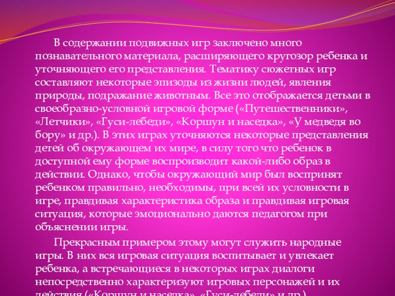 много познавательного материала, расширяющего кругозор ребенка и уточняющего его представления. Тематику сюжетных игр составляют некоторые эпизоды из жизни людей, явления природы, подражание животным. Все это отображается детьми в своеобразно-условной игровой форме («Путешественники», «Летчики», «Гуси-лебеди», «Коршун и наседка», «У медведя во бору» и др.). В этих играх уточняются некоторые представления детей об окружающем их мире, в силу того что ребенок в доступной ему форме воспроизводит какой-либо образ в действии. Однако, чтобы окружающий мир был воспринят ребенком правильно, необходимы, при всей их условности в игре, правдивая характеристика образа и правдивая игровая ситуация, которые эмоционально даются педагогом при объяснении игры.