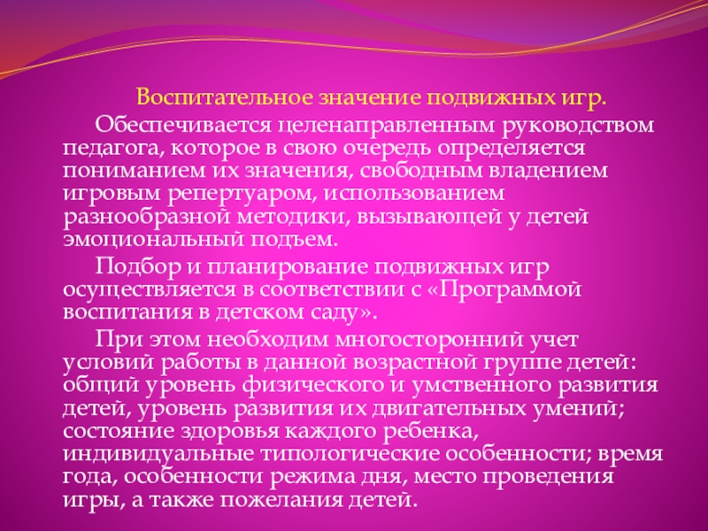 При этом необходим многосторонний учет условий работы в данной возрастной группе детей: общий уровень физического и умственного развития детей, уровень развития их двигательных умений; состояние здоровья каждого ребенка, индивидуальные типологические особенности; время года, особенности режима дня, место проведения игры, а также пожелания детей.