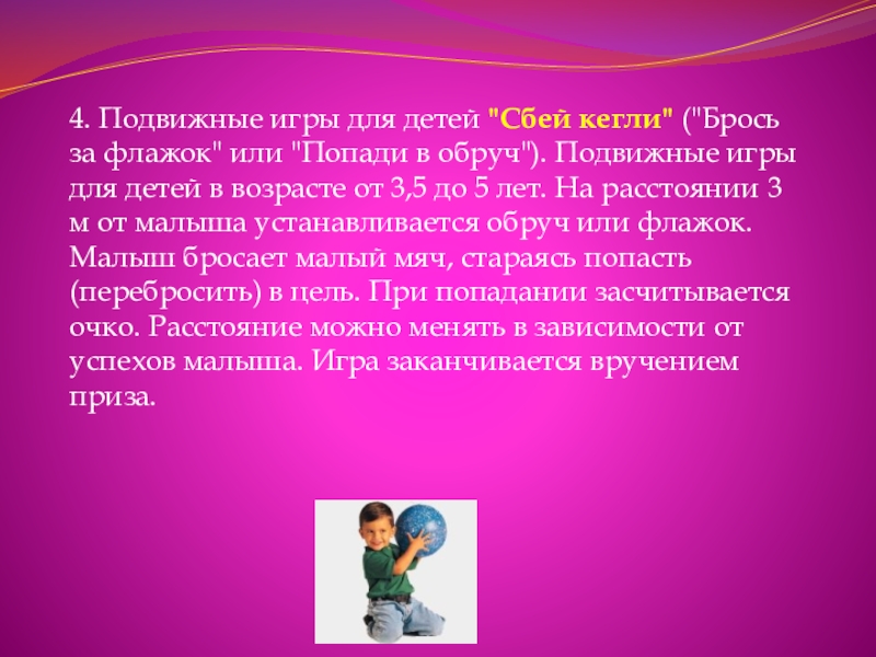 "Попади в обруч"). Подвижные игры для детей в возрасте от 3,5 до 5 лет. На расстоянии 3 м от малыша устанавливается обруч или флажок. Малыш бросает малый мяч, стараясь попасть (перебросить) в цель. При попадании засчитывается очко. Расстояние можно менять в зависимости от успехов малыша. Игра заканчивается вручением приза.