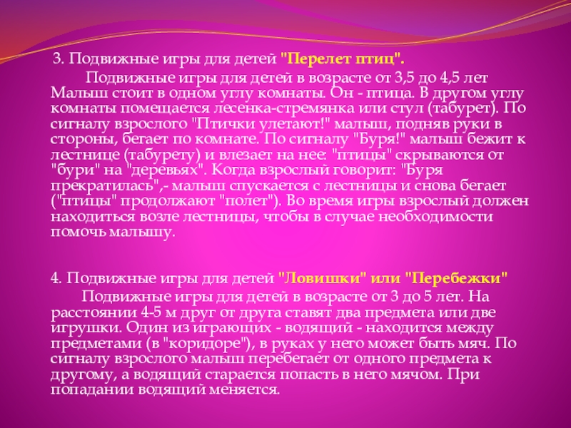 Слайд 17 3. Подвижные игры для детей "Перелет птиц".