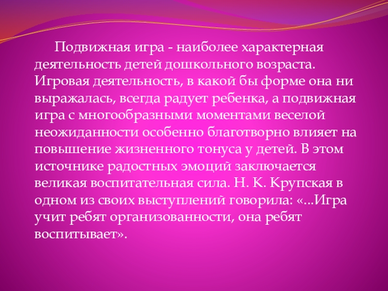 детей дошкольного возраста. Игровая деятельность, в какой бы форме она ни выражалась, всегда радует ребенка, а подвижная игра с многообразными моментами веселой неожиданности особенно благотворно влияет на повышение жизненного тонуса у детей. В этом источнике радостных эмоций заключается великая воспитательная сила. Н. К. Крупская в одном из своих выступлений говорила: «...Игра учит ребят организованности, она ребят воспитывает».