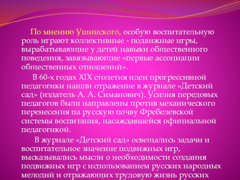 В 60-х годах XIX столетия идеи прогрессивной педагогики нашли отражение в журнале «Детский сад» (издатель А. А. Симанович). Усилия передовых педагогов были направлены против механического перенесения па русскую почву Фребелевской системы воспитания, насаждавшейся официальной педагогикой.