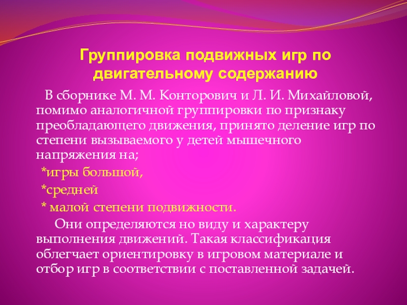 М. М. Конторович и Л. И. Михайловой, помимо аналогичной группировки по признаку преобладающего движения, принято деление игр по степени вызываемого у детей мышечного напряжения на;