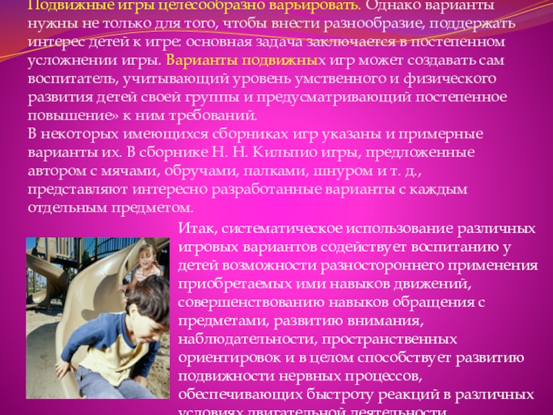 Слайд 14Подвижные игры целесообразно варьировать. Однако варианты нужны не только для того,
