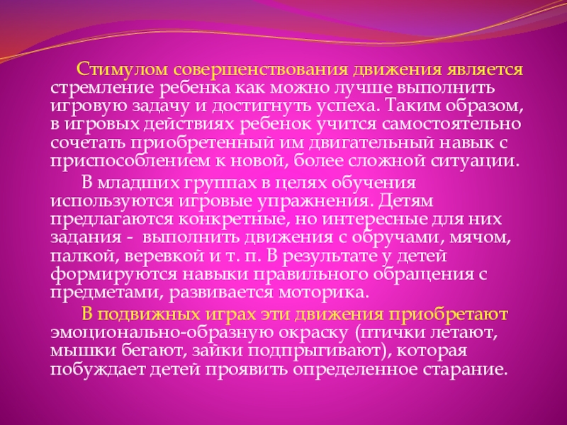 Слайд 12 Стимулом совершенствования движения является стремление ребенка