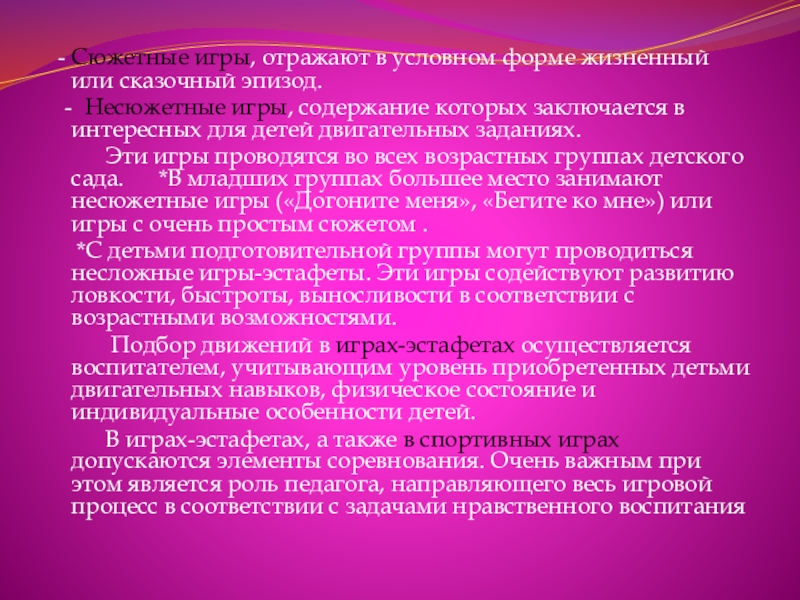 В играх-эстафетах, а также в спортивных играх допускаются элементы соревнования. Очень важным при этом является роль педагога, направляющего весь игровой процесс в соответствии с задачами нравственного воспитания