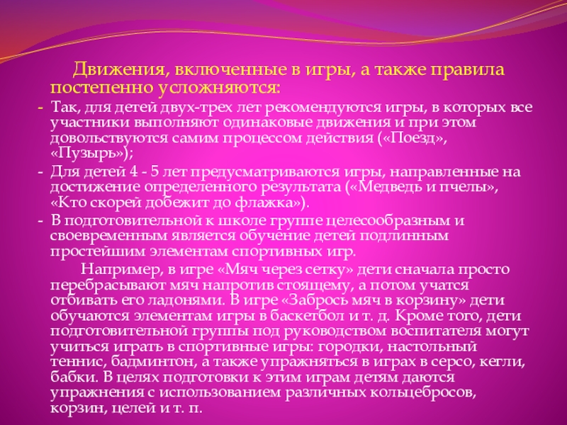 Например, в игре «Мяч через сетку» дети сначала просто перебрасывают мяч напротив стоящему, а потом учатся отбивать его ладонями. В игре «Забрось мяч в корзину» дети обучаются элементам игры в баскетбол и т. д. Кроме того, дети подготовительной группы под руководством воспитателя могут учиться играть в спортивные игры: городки, настольный теннис, бадминтон, а также упражняться в играх в серсо, кегли, бабки. В целях подготовки к этим играм детям даются упражнения с использованием различных кольцебросов, корзин, целей и т. п.