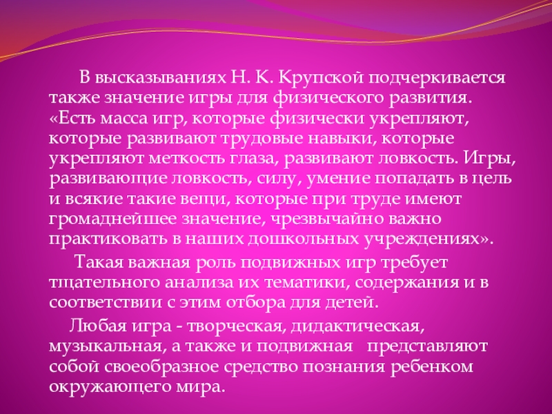 также значение игры для физического развития. «Есть масса игр, которые физически укрепляют, которые развивают трудовые навыки, которые укрепляют меткость глаза, развивают ловкость. Игры, развивающие ловкость, силу, умение попадать в цель и всякие такие вещи, которые при труде имеют громаднейшее значение, чрезвычайно важно практиковать в наших дошкольных учреждениях».