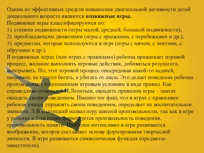 В подвижных играх (или играх с правилами) ребенка привлекает игровой процесс, желание выполнять игровые действия, добиваться результата, выигрывать. Но, этот игровой процесс опосредован какой-то задачей, например, не просто бегать, а убегать от лисы. Это делает поведение ребенка произвольным, подчиненным игровым условиям в виде правил. Как справедливо отмечал А.Н.Леонтьев, овладеть правилом игры – значит овладеть своим поведением. Именно тот факт, что в играх с правилами ребенок учится управлять своим поведением, определяет их воспитательное значение. Л.В.Выготский назвал игру школой произвольности, так как в игре у ребенка к 5-ти годам формируется произвольность поведения, произвольность памяти. Наиболее интенсивно в игре развивается воображение, которое составляет основу формирования творческой личности. В игре развивается символическая функция (предметы-заместители).