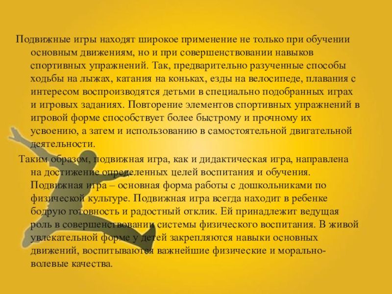 В подвижной игре дошкольник многократно самостоятельно повторяет движения, заданные темой и правилами, что чрезвычайно благоприятно влияет на их усвоение и является важной составной частью процесса обучения.