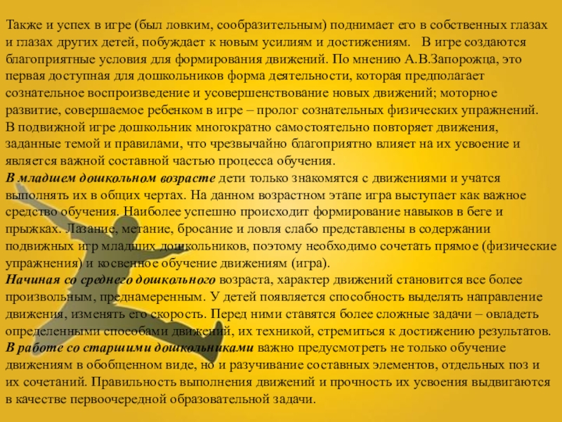 собственных глазах и глазах других детей, побуждает к новым усилиям и достижениям. В игре создаются благоприятные условия для формирования движений. По мнению А.В.Запорожца, это первая доступная для дошкольников форма деятельности, которая предполагает сознательное воспроизведение и усовершенствование новых движений; моторное развитие, совершаемое ребенком в игре – пролог сознательных физических упражнений.