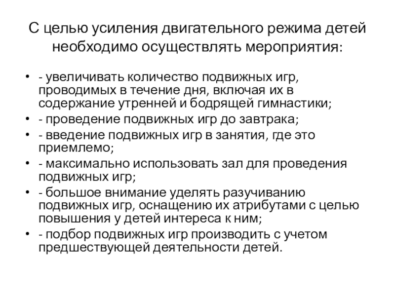 Слайд 11С целью усиления двигательного режима детей необходимо осуществлять мероприятия: