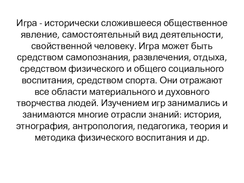 Слайд 3Игра - исторически сложившееся общественное явление, самостоятельный вид деятельности, свойственной человеку.