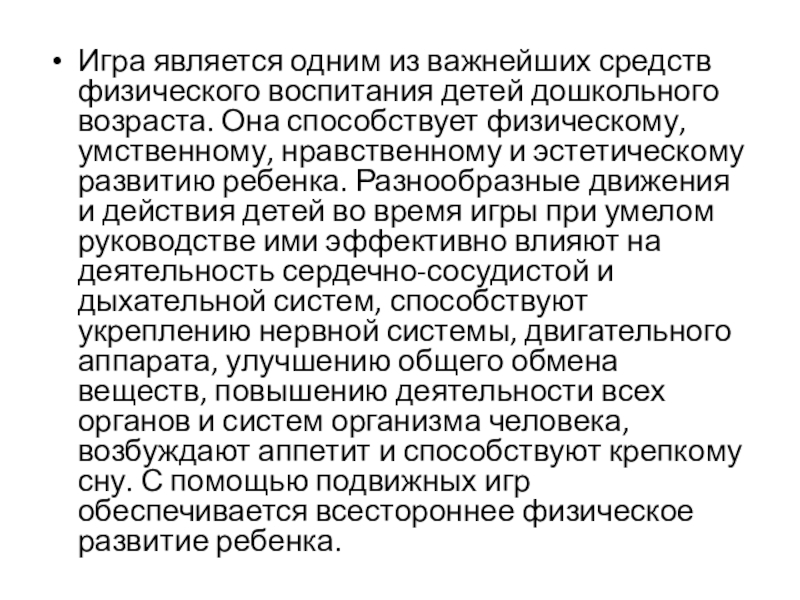Она способствует физическому, умственному, нравственному и эстетическому развитию ребенка. Разнообразные движения и действия детей во время игры при умелом руководстве ими эффективно влияют на деятельность сердечно-сосудистой и дыхательной систем, способствуют укреплению нервной системы, двигательного аппарата, улучшению общего обмена веществ, повышению деятельности всех органов и систем организма человека, возбуждают аппетит и способствуют крепкому сну. С помощью подвижных игр обеспечивается всестороннее физическое развитие ребенка.