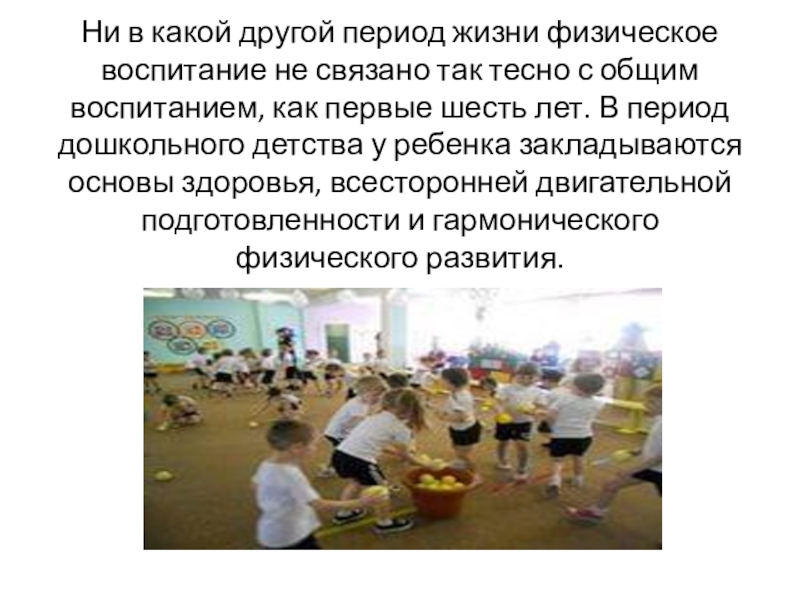 тесно с общим воспитанием, как первые шесть лет. В период дошкольного детства у ребенка закладываются основы здоровья, всесторонней двигательной подготовленности и гармонического физического развития.