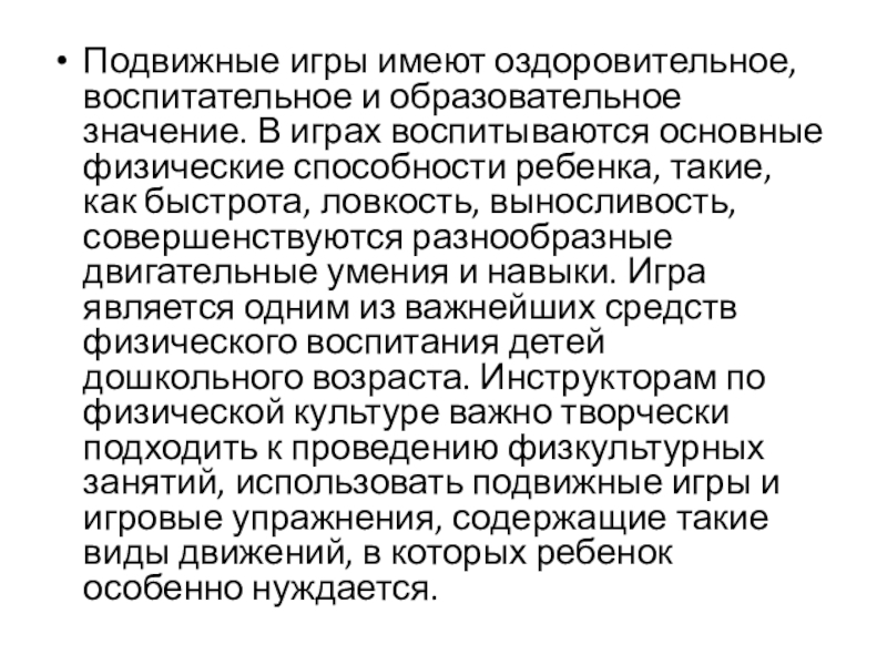 основные физические способности ребенка, такие, как быстрота, ловкость, выносливость, совершенствуются разнообразные двигательные умения и навыки. Игра является одним из важнейших средств физического воспитания детей дошкольного возраста. Инструкторам по физической культуре важно творчески подходить к проведению физкультурных занятий, использовать подвижные игры и игровые упражнения, содержащие такие виды движений, в которых ребенок особенно нуждается.