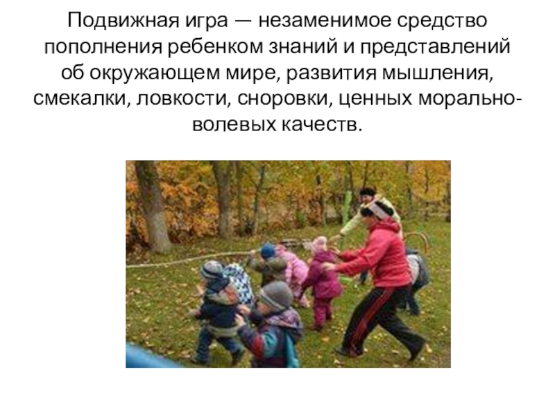 Слайд 10Подвижная игра — незаменимое средство пополнения ребенком знаний и представлений об