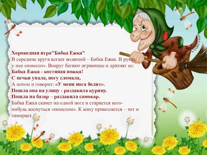 руках у нее «помело». Вокруг бегают играющие и дразнят ее: