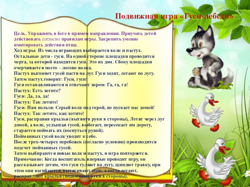 Примечание: Когда воспитатель впервые проводит игру, он рассказывает детям, что гуси гуляют на лугу, щиплют травку, при этом они нагибаются, вытягивают шею, а когда летают, расправляют крылья (поднимают руки в стороны).