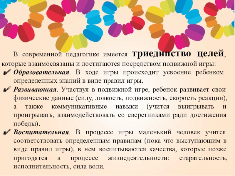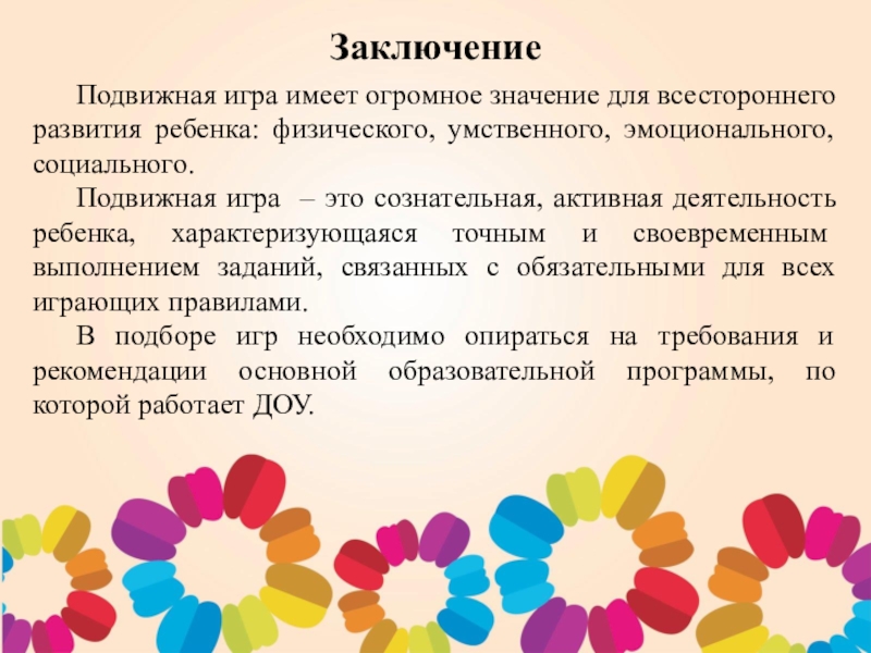 Подвижная игра – это сознательная, активная деятельность ребенка, характеризующаяся точным и своевременным выполнением заданий, связанных с обязательными для всех играющих правилами.