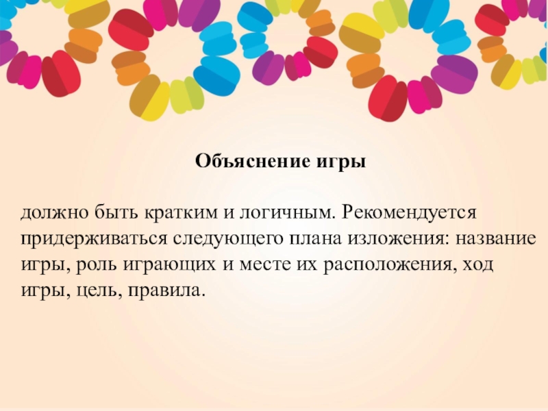 должно быть кратким и логичным. Рекомендуется придерживаться следующего плана изложения: название игры, роль играющих и месте их расположения, ход игры, цель, правила.