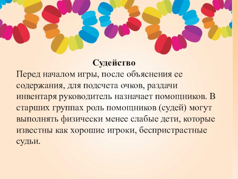 Перед началом игры, после объяснения ее содержания, для подсчета очков, раздачи инвентаря руководитель назначает помощников. В старших группах роль помощников (судей) могут выполнять физически менее слабые дети, которые известны как хорошие игроки, беспристрастные судьи.