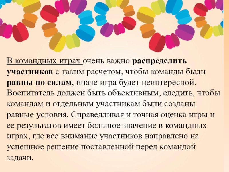 команды были равны по силам, иначе игра будет неинтересной. Воспитатель должен быть объективным, следить, чтобы командам и отдельным участникам были созданы равные условия. Справедливая и точная оценка игры и ее результатов имеет большое значение в командных играх, где все внимание участников направлено на успешное решение поставленной перед командой задачи.
