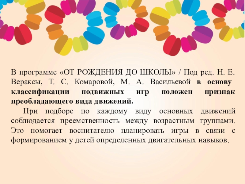 Вераксы, Т. С. Комаровой, М. А. Васильевой в основу классификации подвижных игр положен признак преобладающего вида движений.