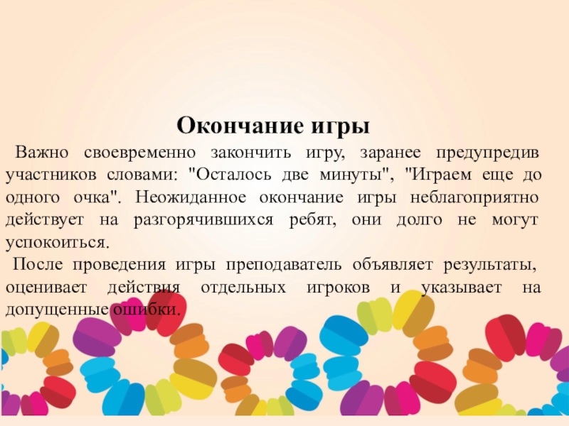 Важно своевременно закончить игру, заранее предупредив участников словами: "Осталось две минуты", "Играем еще до одного очка". Неожиданное окончание игры неблагоприятно действует на разгорячившихся ребят, они долго не могут успокоиться.