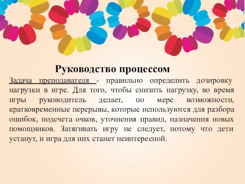 Задача преподавателя - правильно определить дозировку нагрузки в игре. Для того, чтобы снизить нагрузку, во время игры руководитель делает, по мере возможности, кратковременные перерывы, которые используются для разбора ошибок, подсчета очков, уточнения правил, назначения новых помощников. Затягивать игру не следует, потому что дети устанут, и игра для них станет неинтересной.
