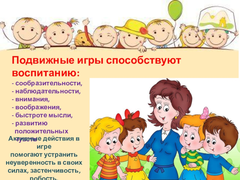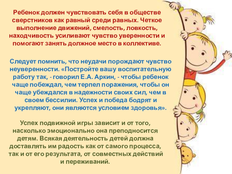 Успех подвижной игры зависит и от того, насколько эмоционально она преподносится детям. Всякая деятельность детей должна доставлять им радость как от самого процесса, так и от его результата, от совместных действий и переживаний.