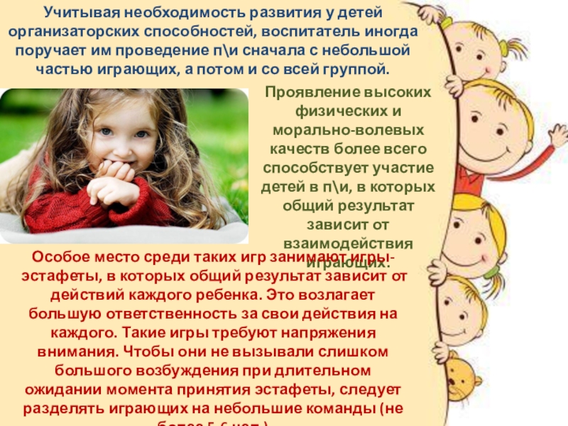 Особое место среди таких игр занимают игры-эстафеты, в которых общий результат зависит от действий каждого ребенка. Это возлагает большую ответственность за свои действия на каждого. Такие игры требуют напряжения внимания. Чтобы они не вызывали слишком большого возбуждения при длительном ожидании момента принятия эстафеты, следует разделять играющих на небольшие команды (не более 5-6 чел.)