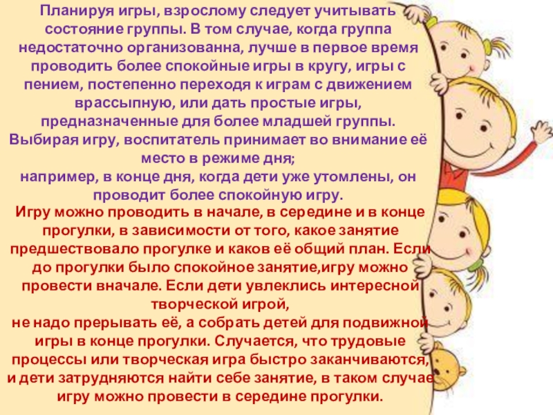 не надо прерывать её, а собрать детей для подвижной игры в конце прогулки. Случается, что трудовые процессы или творческая игра быстро заканчиваются, и дети затрудняются найти себе занятие, в таком случае игру можно провести в середине прогулки.
