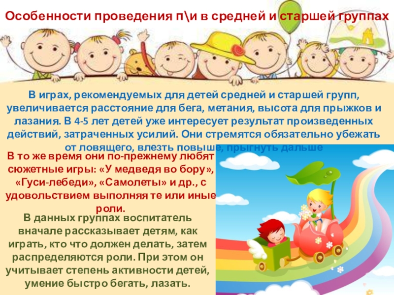В данных группах воспитатель вначале рассказывает детям, как играть, кто что должен делать, затем распределяются роли. При этом он учитывает степень активности детей, умение быстро бегать, лазать.
