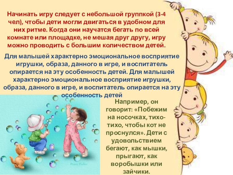 Например, он говорит: «Побежим на носочках, тихо-тихо, чтобы кот не проснулся». Дети с удовольствием бегают, как мышки, прыгают, как воробышки или зайчики.