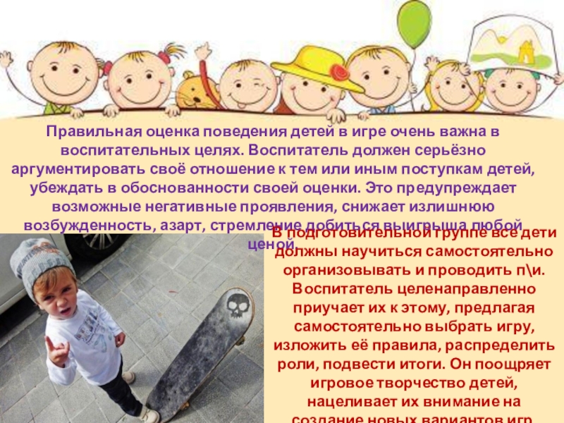 В подготовительной группе все дети должны научиться самостоятельно организовывать и проводить п\и. Воспитатель целенаправленно приучает их к этому, предлагая самостоятельно выбрать игру, изложить её правила, распределить роли, подвести итоги. Он поощряет игровое творчество детей, нацеливает их внимание на создание новых вариантов игр.