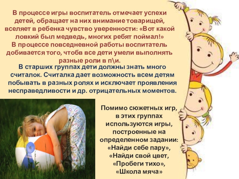 В старших группах дети должны знать много считалок. Считалка дает возможность всем детям побывать в разных ролях и исключает проявления несправедливости и др. отрицательных моментов.