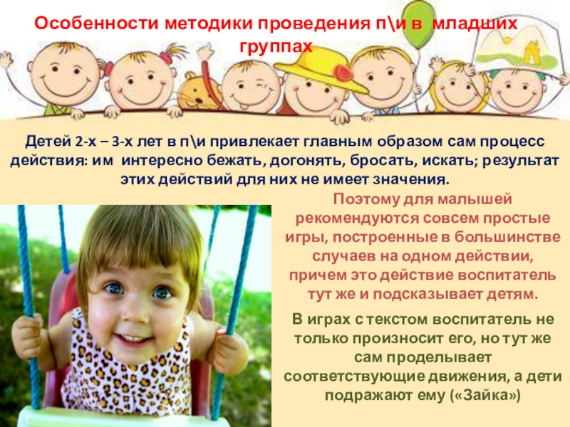 Поэтому для малышей рекомендуются совсем простые игры, построенные в большинстве случаев на одном действии, причем это действие воспитатель тут же и подсказывает детям.