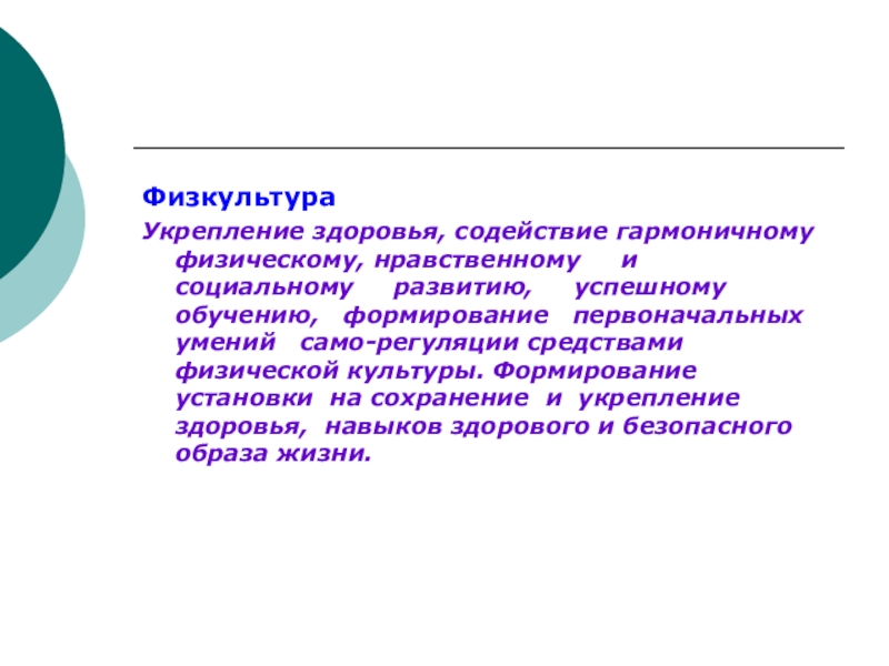 социальному развитию, успешному обучению, формирование первоначальных умений само-регуляции средствами физической культуры. Формирование установки на сохранение и укрепление здоровья, навыков здорового и безопасного образа жизни.