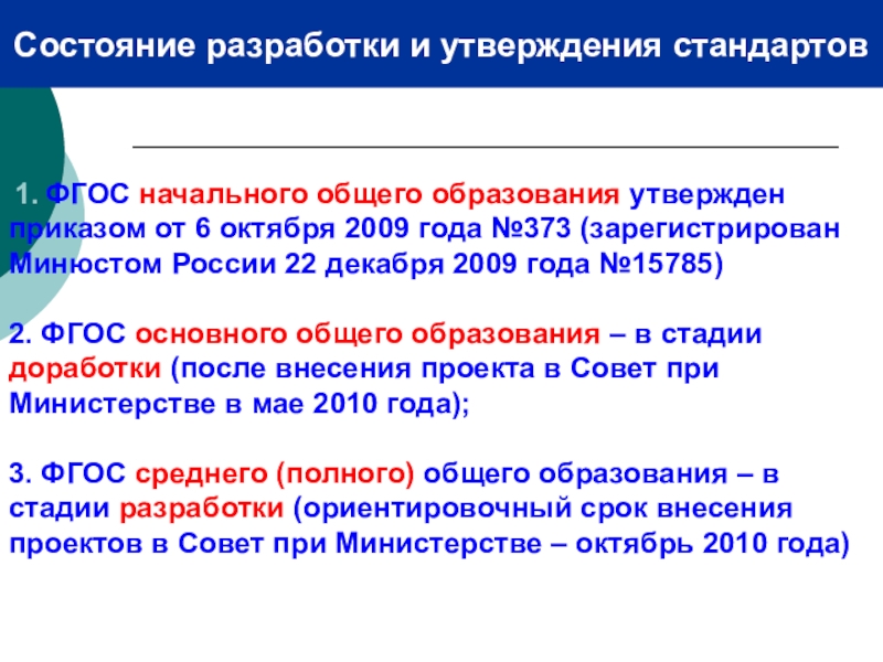 3. ФГОС среднего (полного) общего образования – в стадии разработки (ориентировочный срок внесения проектов в Совет при Министерстве – октябрь 2010 года)