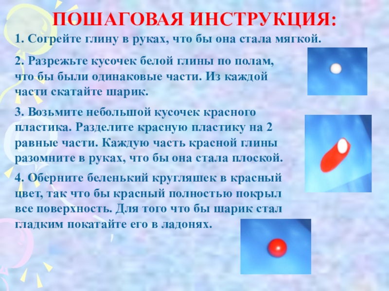 4. Оберните беленький кругляшек в красный цвет, так что бы красный полностью покрыл все поверхность. Для того что бы шарик стал гладким покатайте его в ладонях.