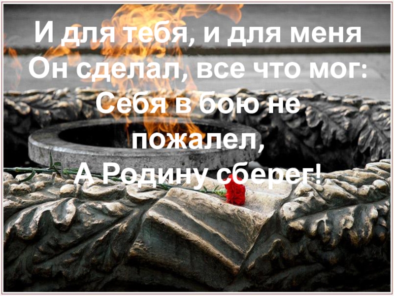 И для тебя, и для меняОн сделал, все что мог:Себя в бою не пожалел,А Родину сберег!