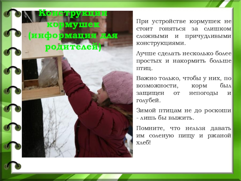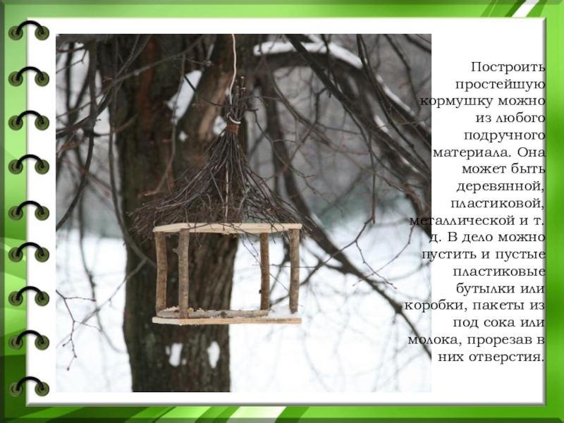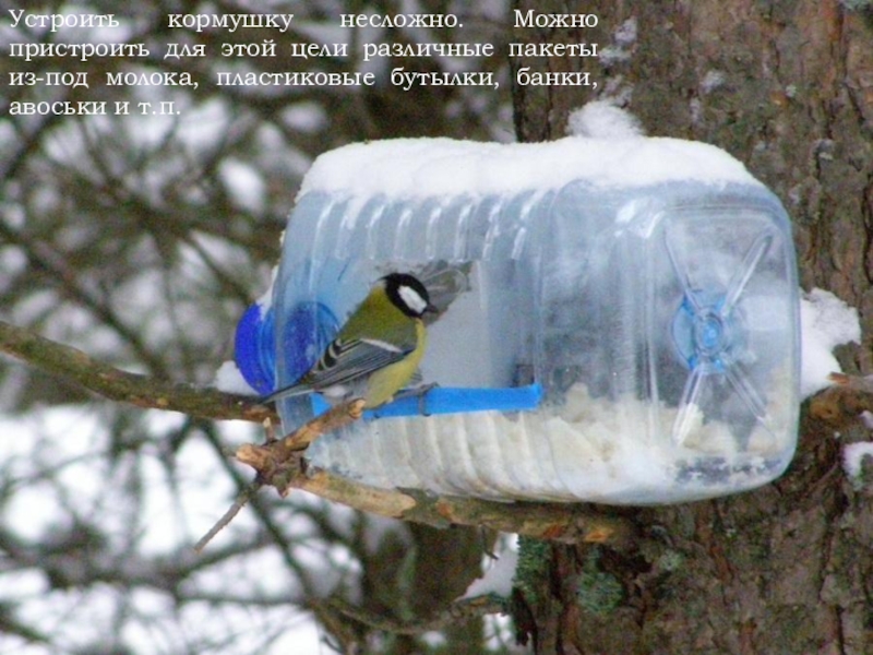Слайд 28При устройстве кормушек не стоит гоняться за слишком сложными и причудливыми