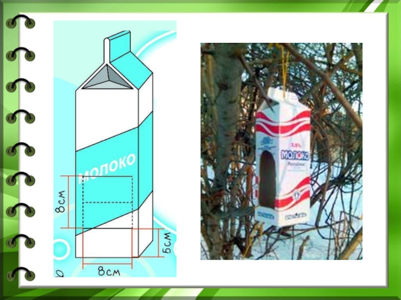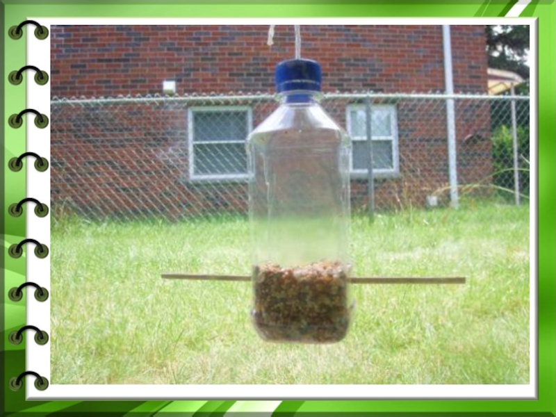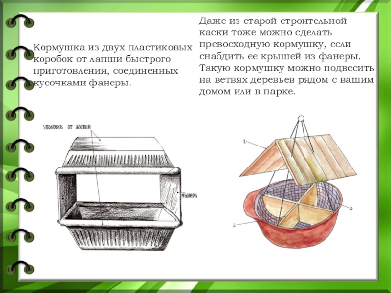 Слайд 32Кормушка из двух пластиковых коробок от лапши быстрого приготовления, соединенных кусочками