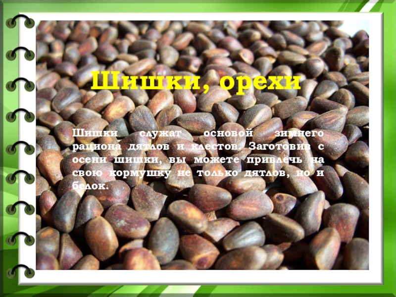 Слайд 23Шишки служат основой зимнего рациона дятлов и клестов. Заготовив с осени