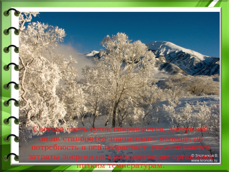 Слайд 4Светлая часть суток сокращается, доступной пищи становится значительно меньше, но потребность