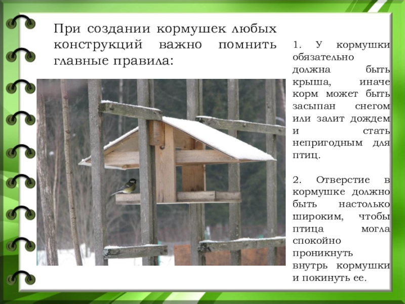 Слайд 291. У кормушки обязательно должна быть крыша, иначе корм может быть