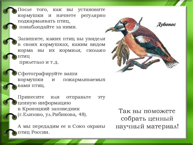 нужно записать точную надпись на кольце, место, где обнаружена птица, дату и обстоятельства находки.