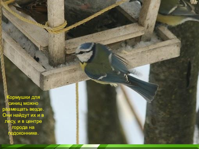 Слайд 13Кормушки для синиц можно размещать везде. Они найдут их и в